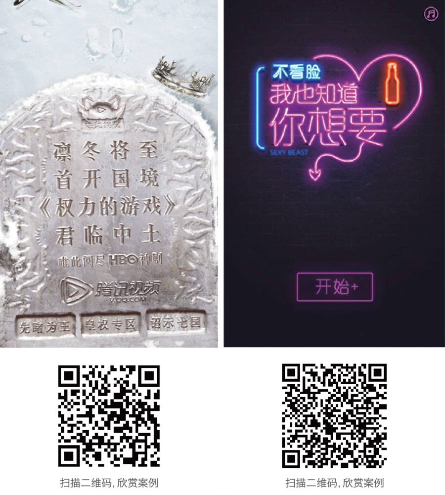 这两支广告均来自腾讯视频,第一支我在之前的文章中介绍过,因为它比较特别的形势,和呆板的幻灯片式样的H5拉开了距离,第二支则是因为它比较好的声画同步展示,可以很快抓住用户的注意力,这两支H5我觉得在美术和执行上会逊色于上面的作品,但是在互动体验上确更为出色!