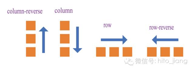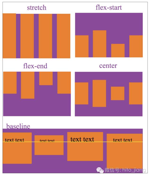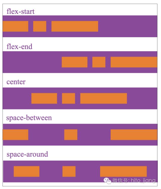 的对齐方式和主轴的方向有关,下图以flex-direction