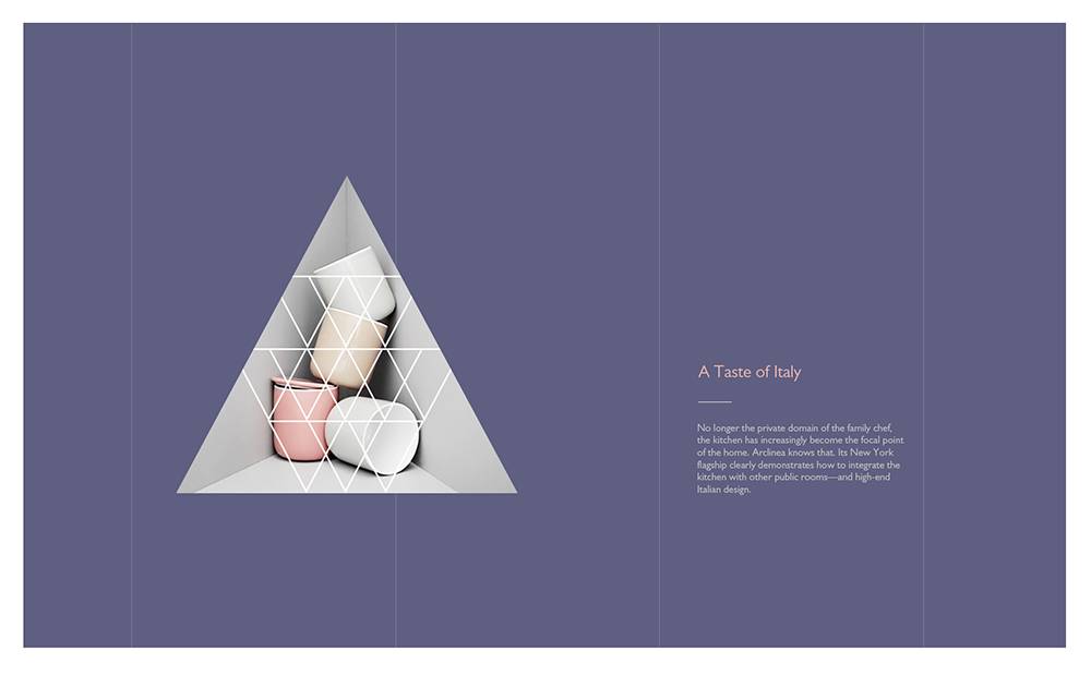 由于三角其实也是矩形的一半,因此用三角形来引申出矩形的意向,经过巧妙地构图安排,同样可以发挥矩形布局的效果。